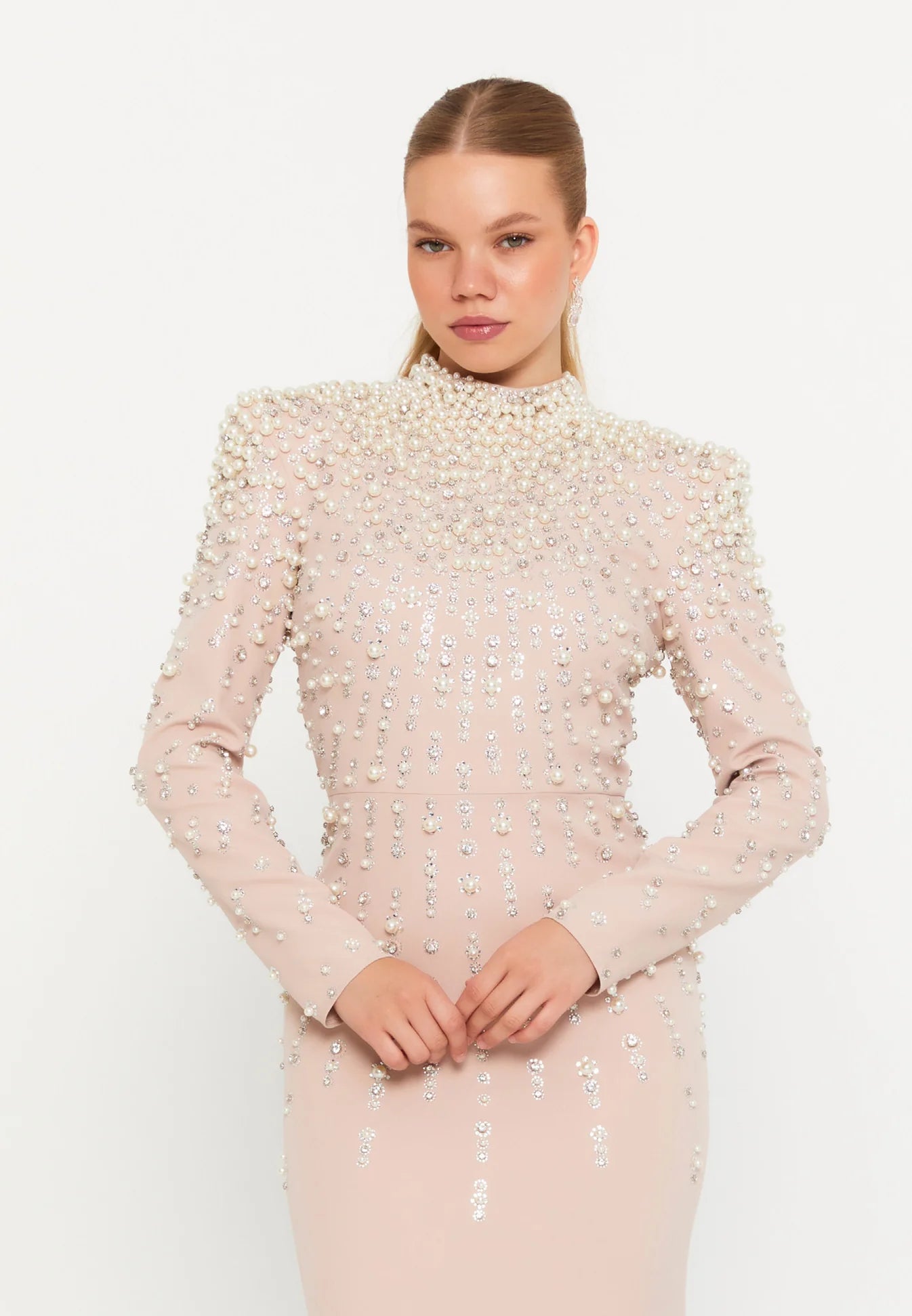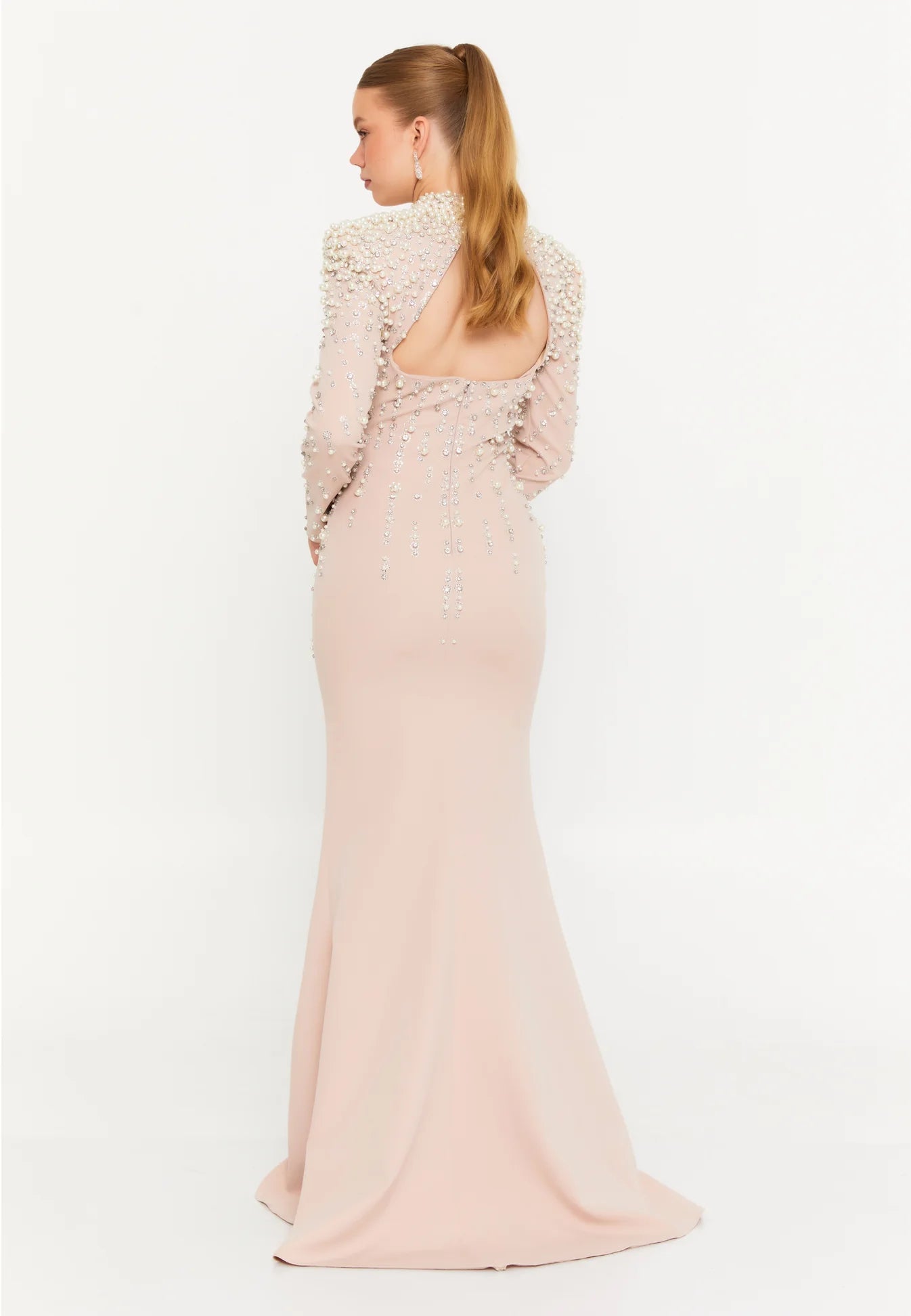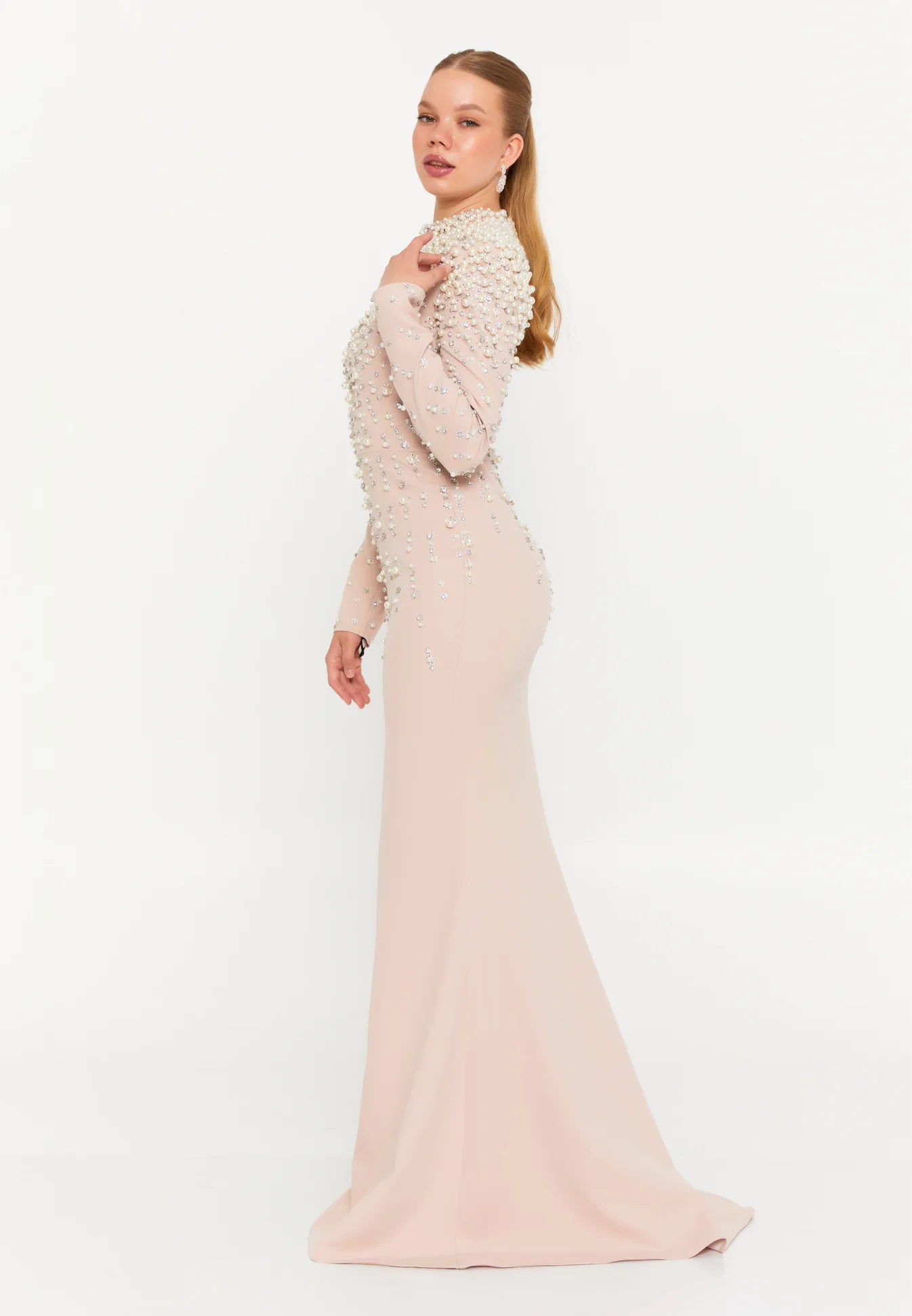 فستان سهرة بأكمام مطرز باللؤلؤ والكريستال