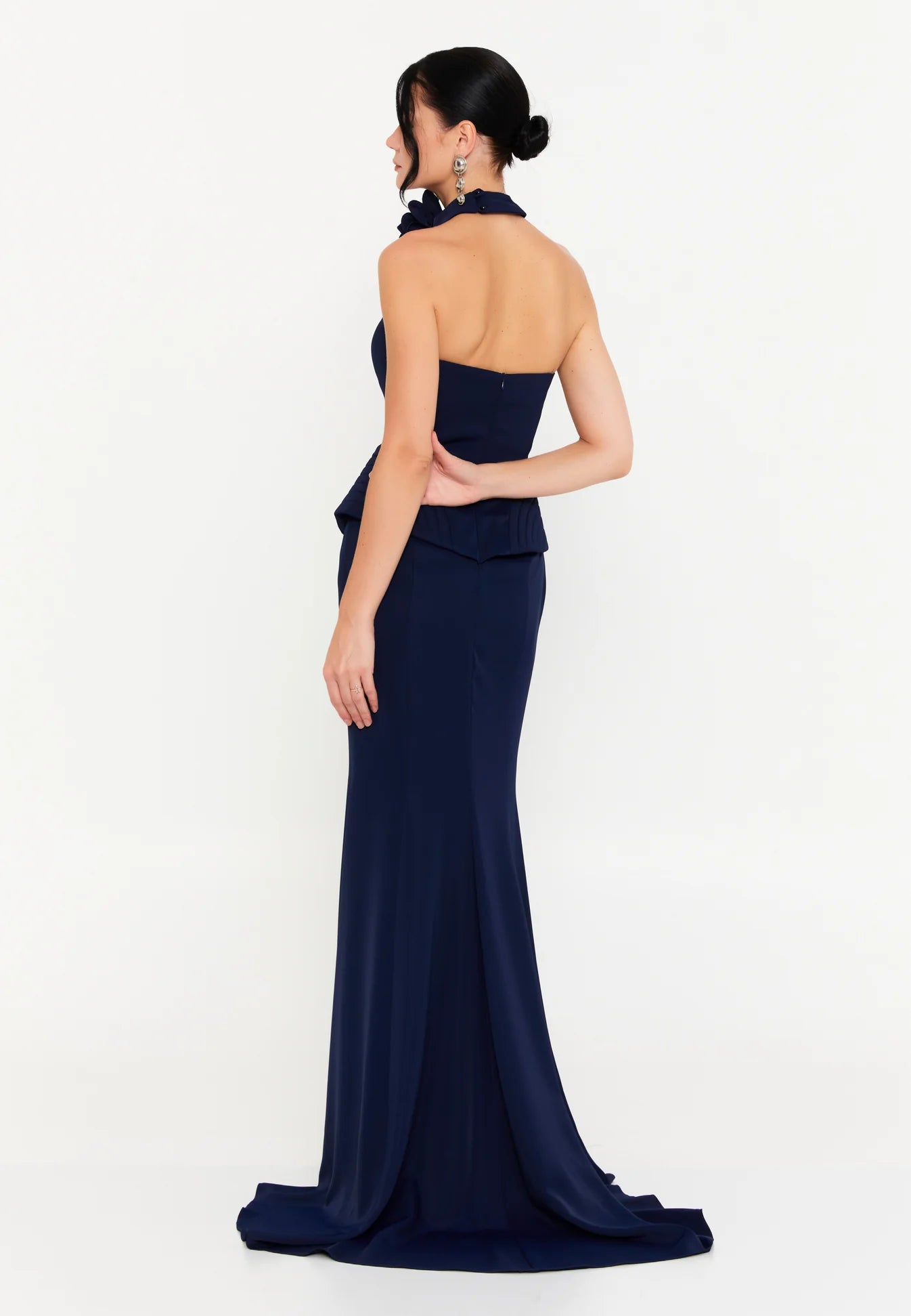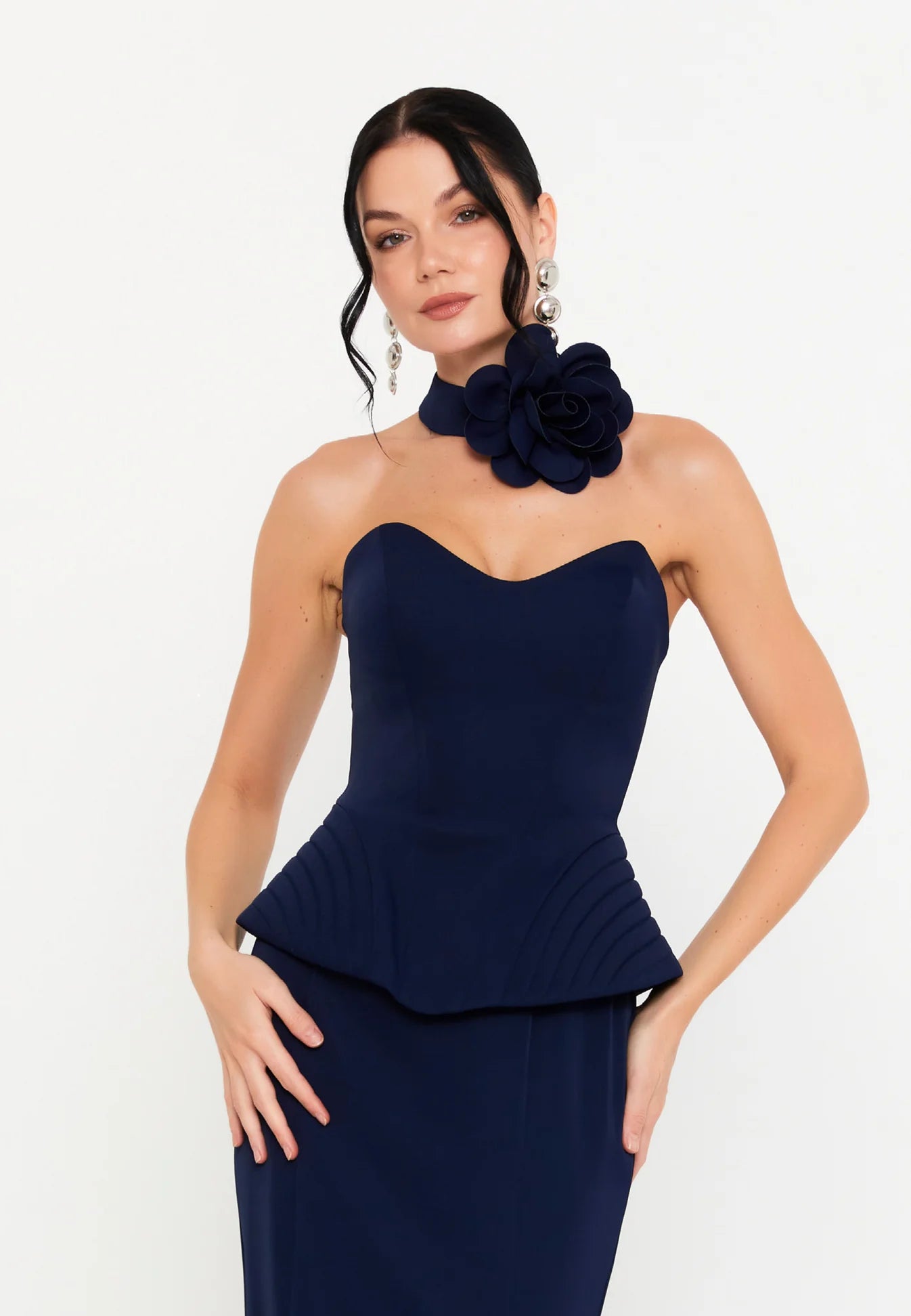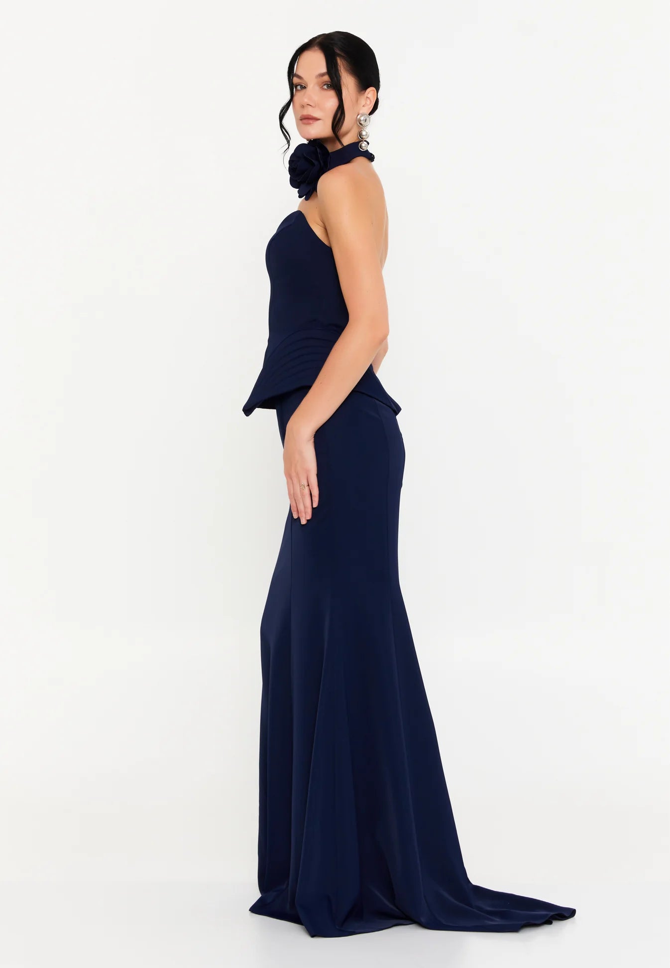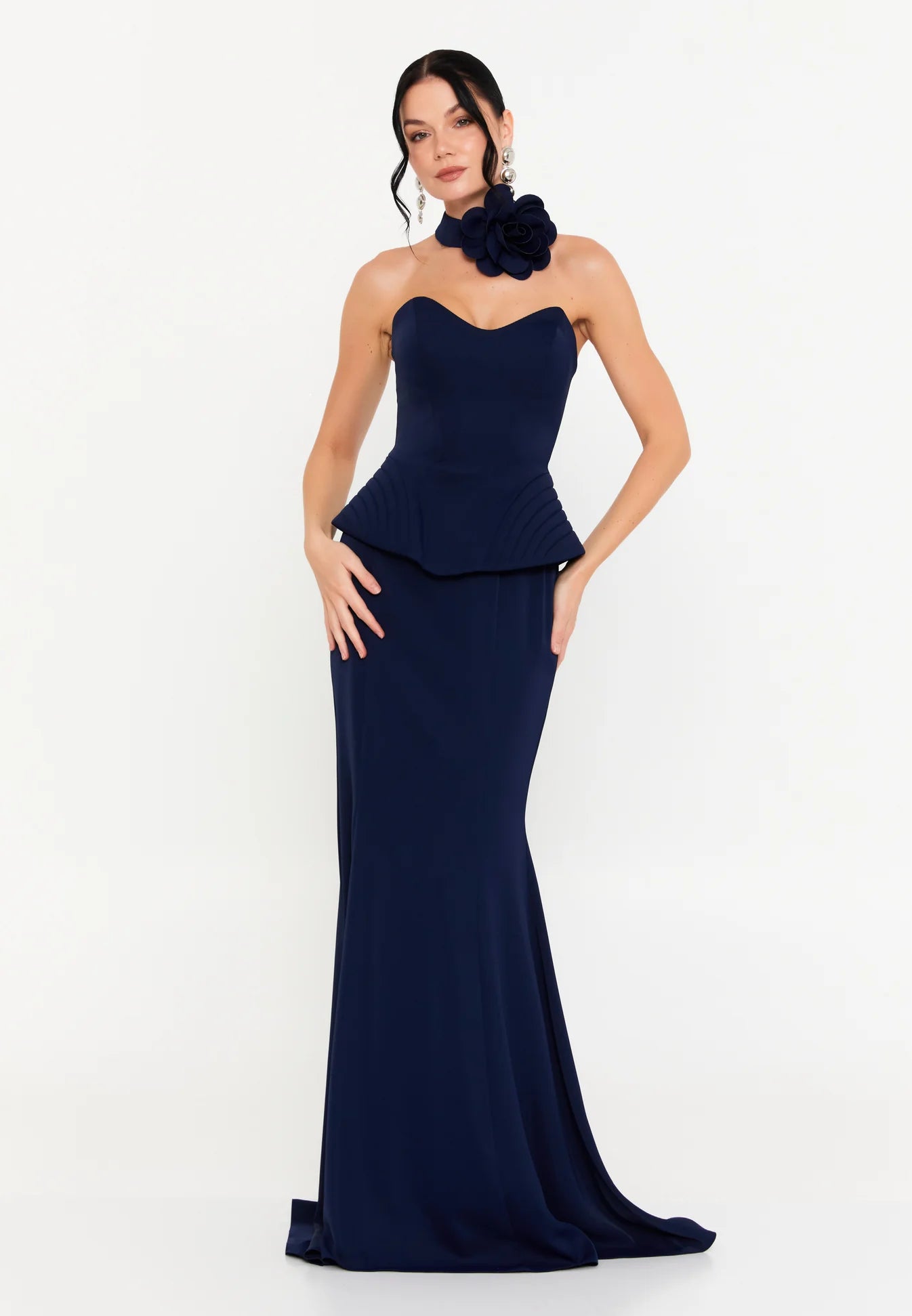فستان سهرة كحلي طويل بدون أكمام مع وردة على الرقبة وكشكشة عند الخصر