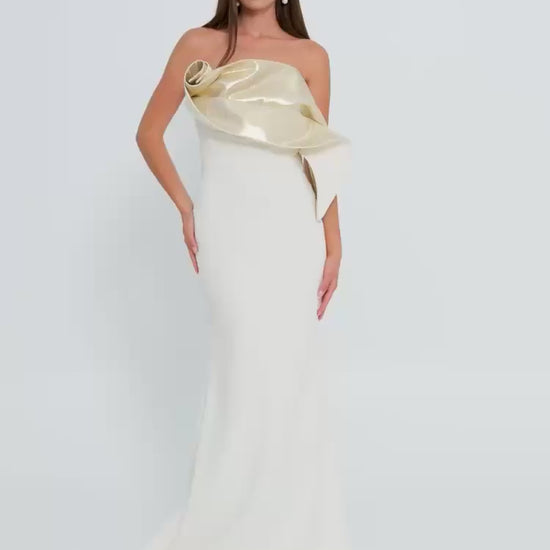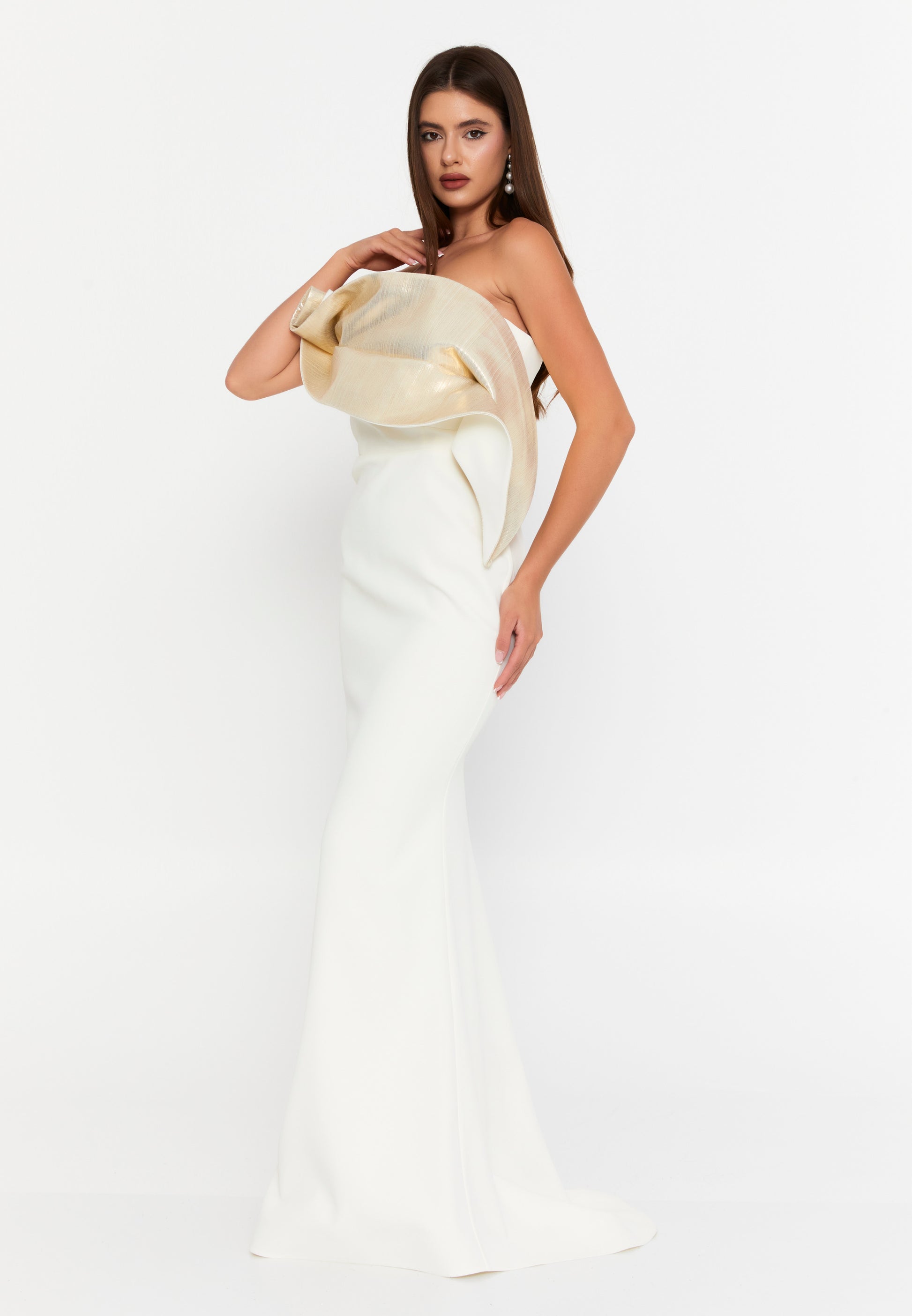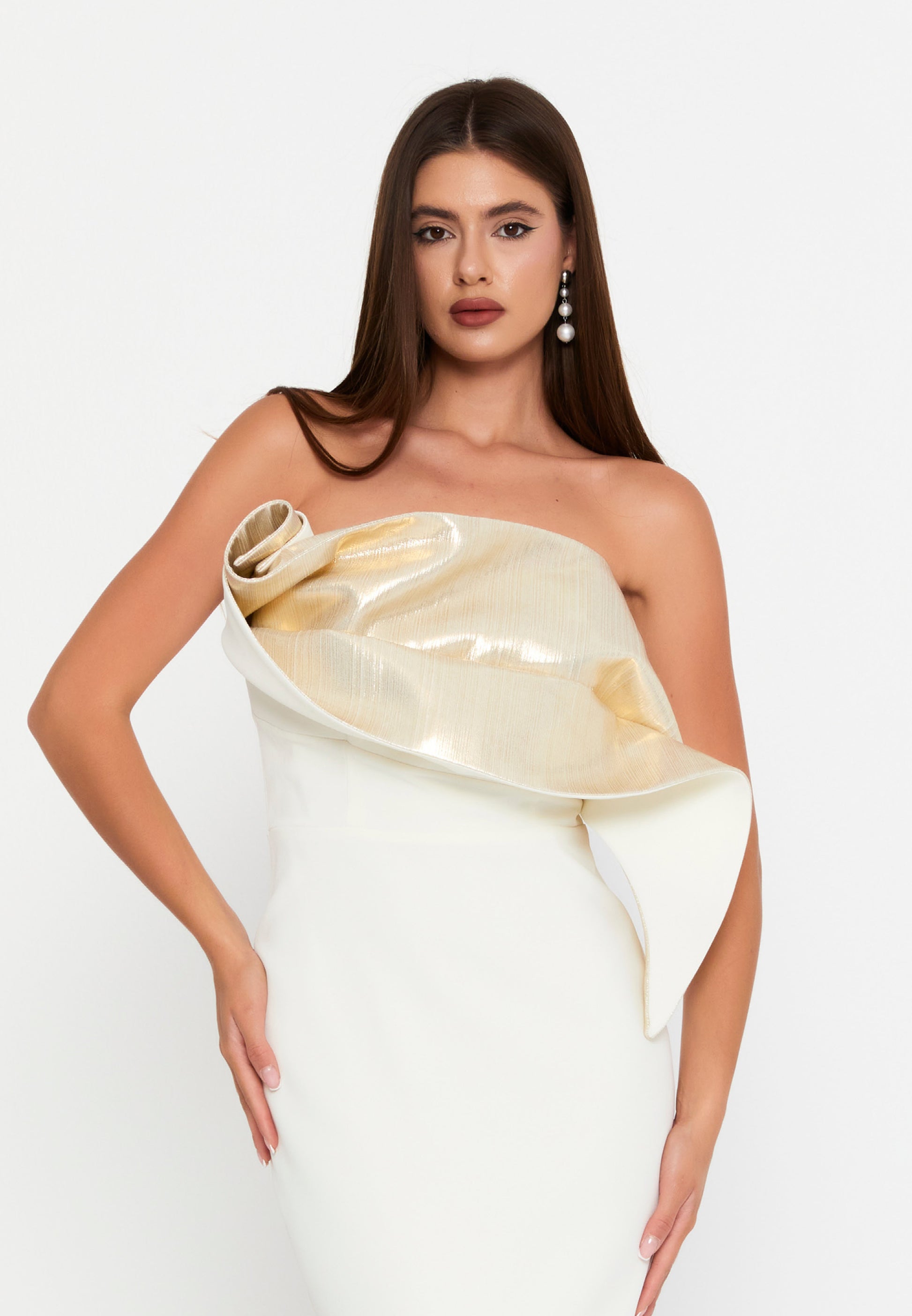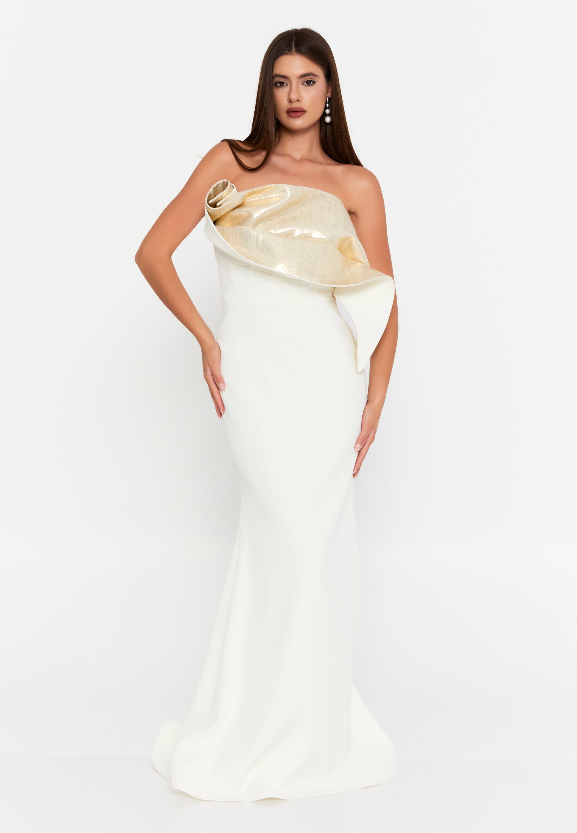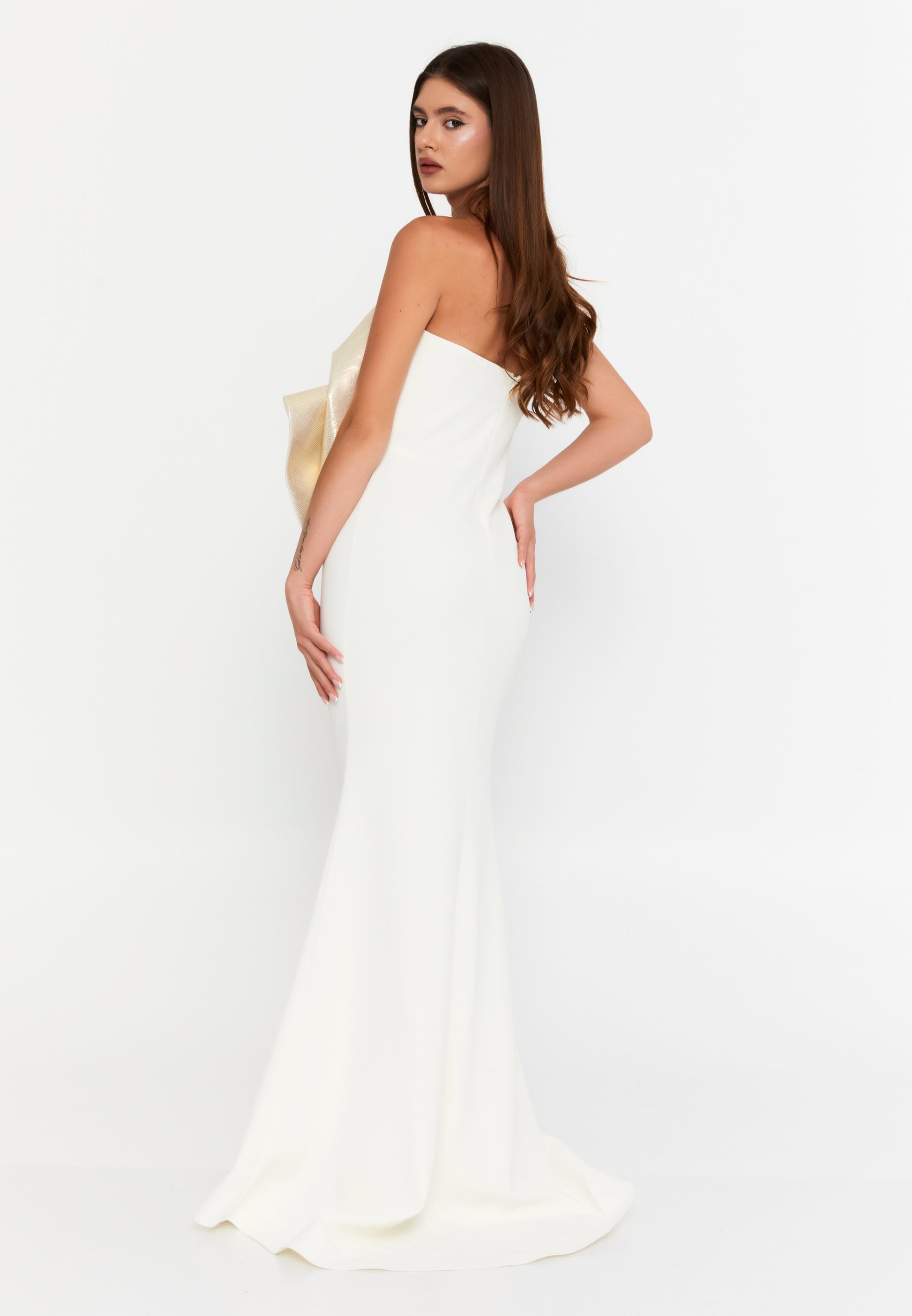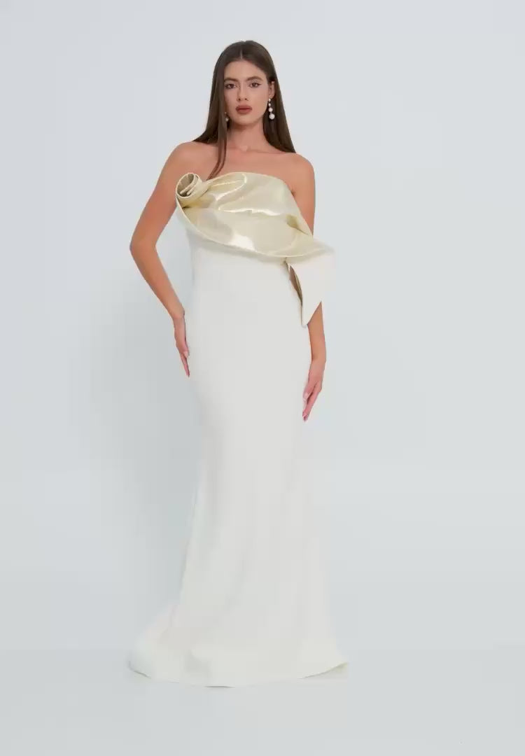 فستان أبيض سترابلس بتفاصيل ذهبي